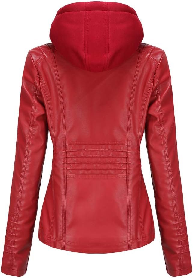 Women’s Stylish Red Faux Leather Jacket with Hood & Zipper Pockets